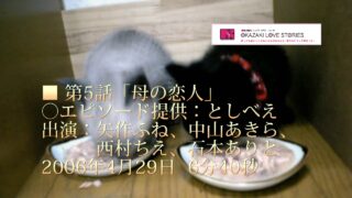 ■ 第5話「母の恋人」○エピソード提供:としべえ出演:矢作ふね、中山あきら、 西村ちえ、石本ありと 2006年4月29日 6分40秒